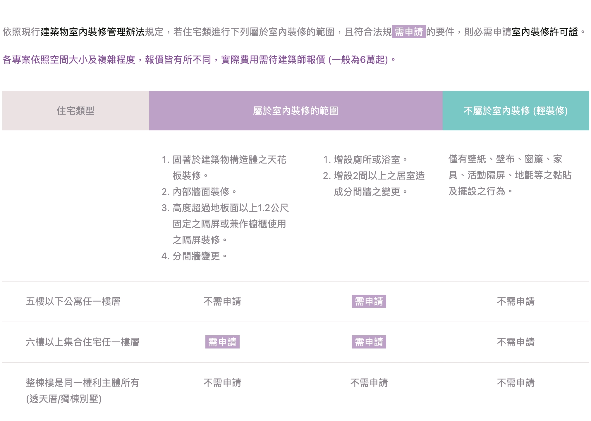 無隔間,或對於現有隔間滿意 | 需做新裝修,或裝修老舊了需要更新。